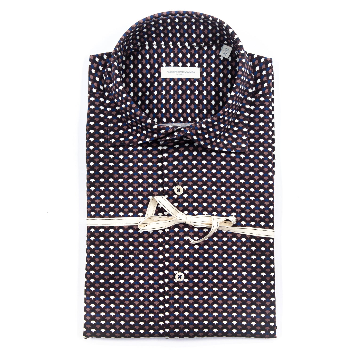 Aggiungi carattere e personalità al tuo look con questa camicia Alessandro Lamura dal design geometrico multicolore, caratterizzata da un motivo a mezzaluna nei toni del blu, marrone, bianco e bordeaux. Un modello moderno e distintivo, ideale per chi ama uno stile ricercato senza rinunciare alla versatilità.