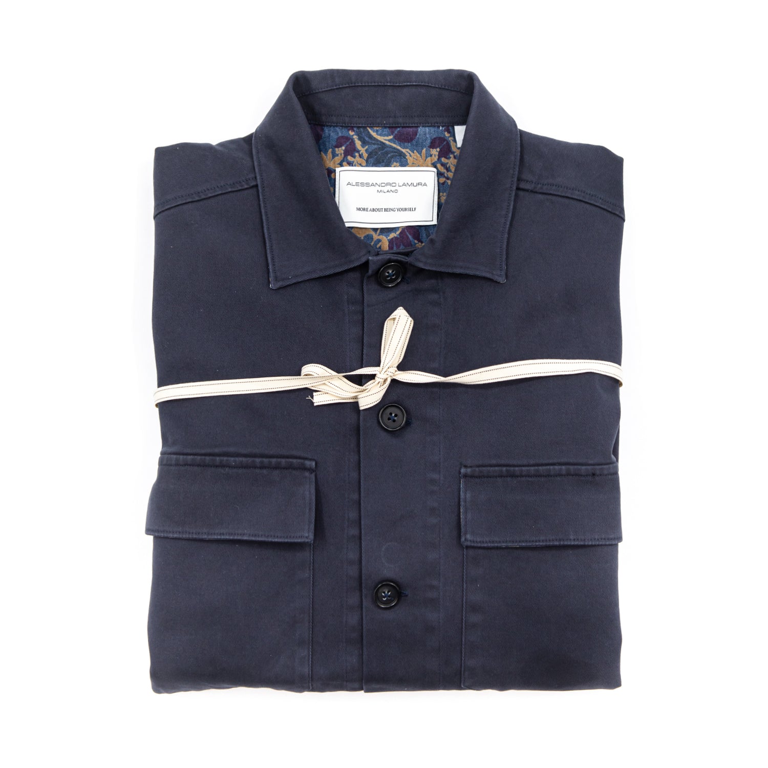 Una shirt jacket essenziale e sofisticata, realizzata da Alessandro Lamura in morbido cotone blu navy. La fodera interna a motivo floreale aggiunge un tocco ricercato e contemporaneo, rendendo questo capo perfetto per chi ama lo stile pulito ma distintivo.