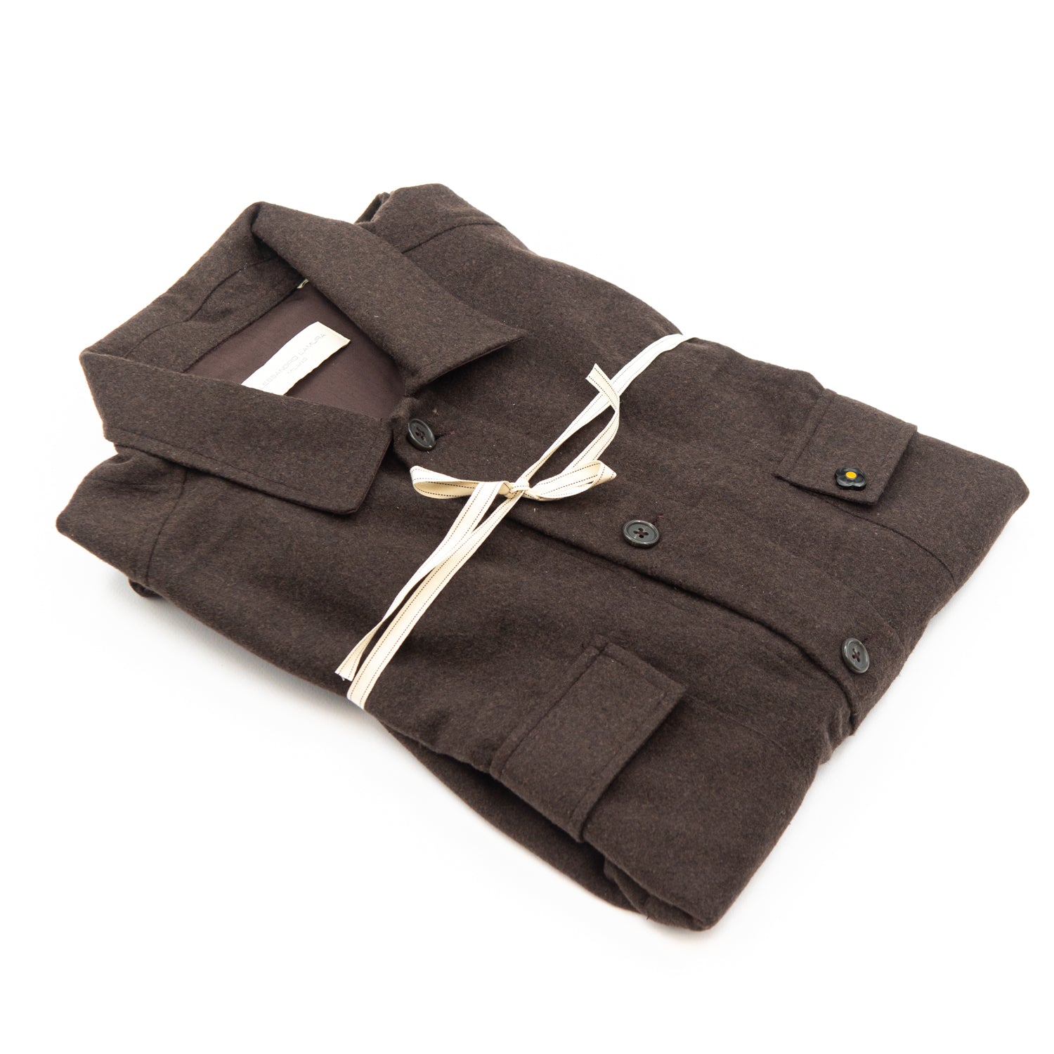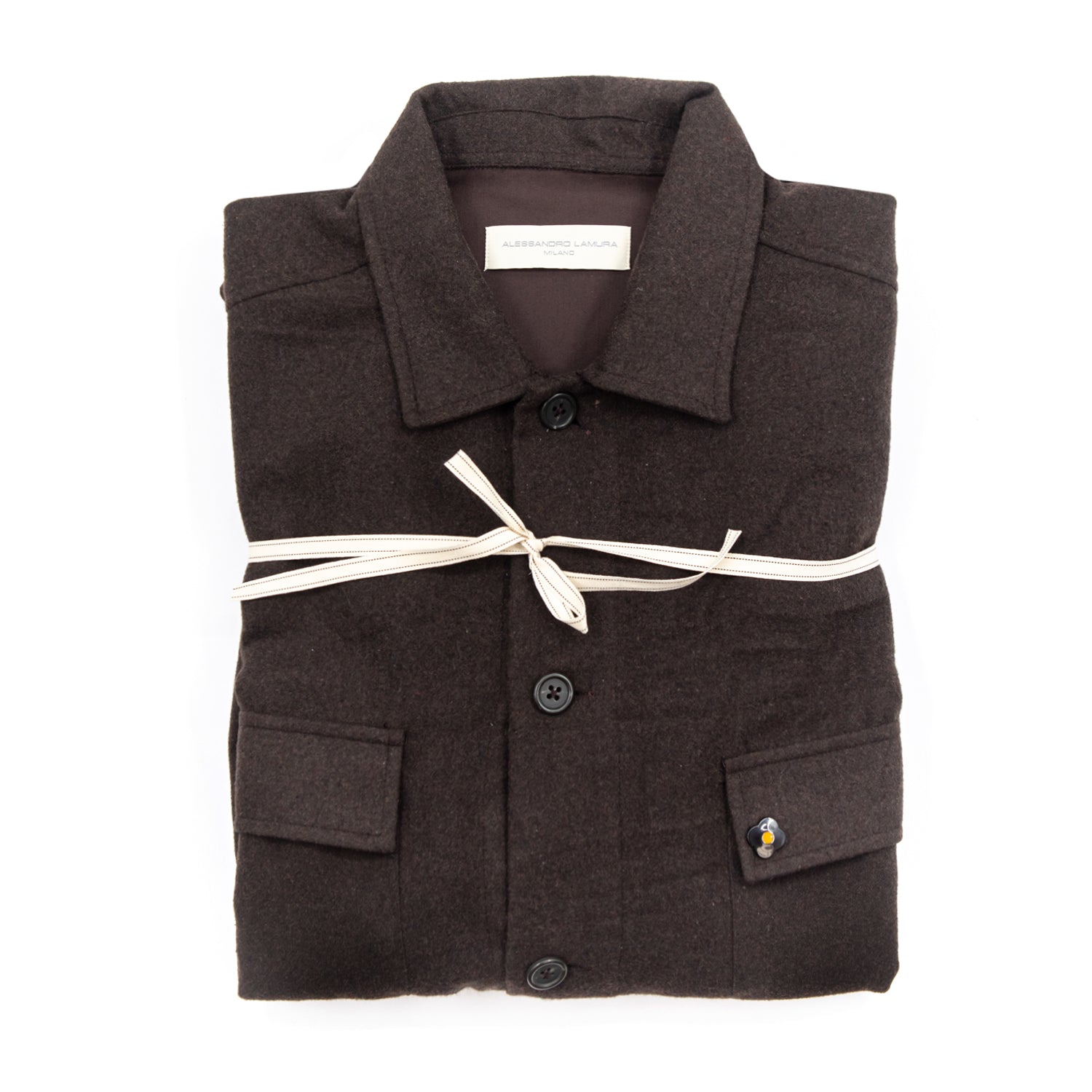 Eleganza senza tempo e comfort assoluto si fondono in questa shirt jacket Alessandro Lamura. Realizzata in lana calda color cioccolato, offre una texture morbida e un design minimale arricchito da dettagli raffinati, come il bottone decorativo a forma di fiore.