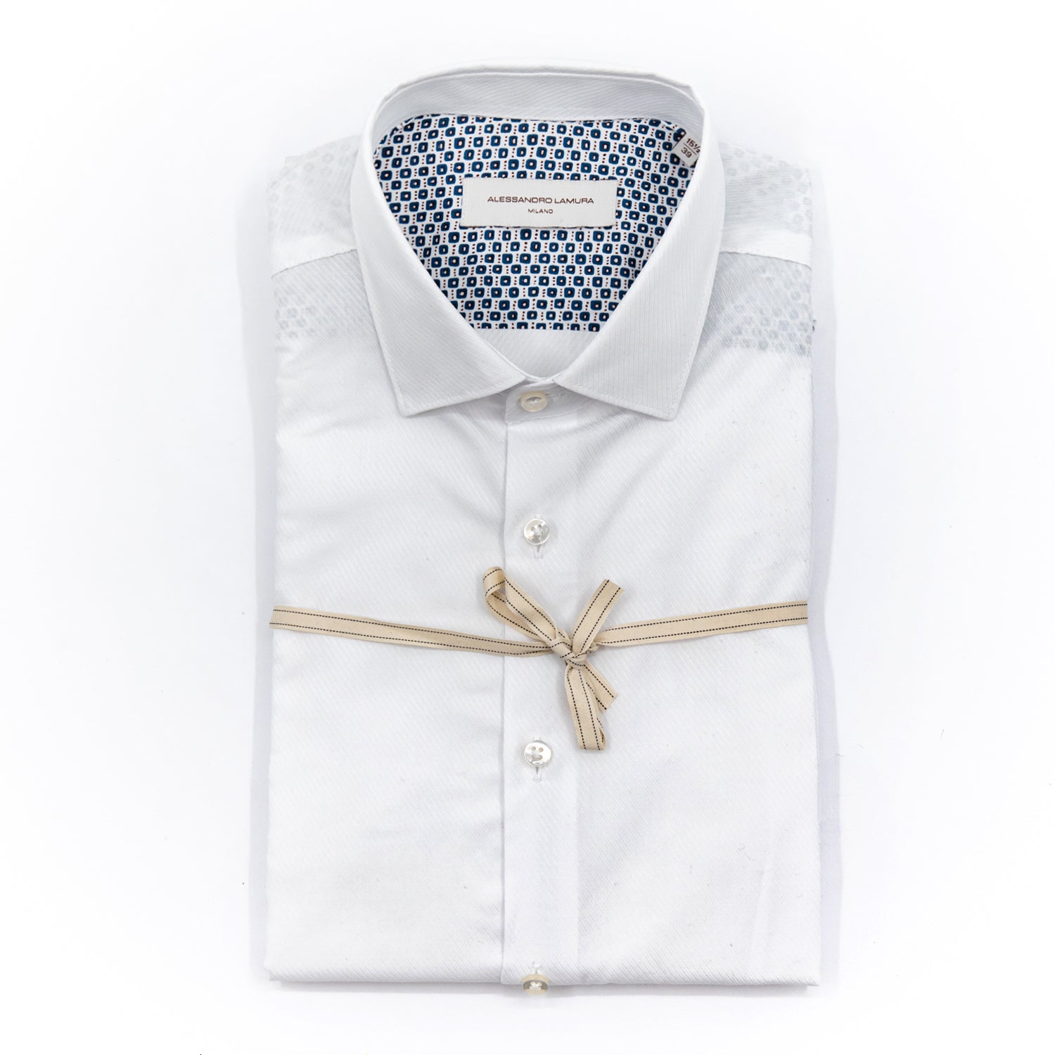 Un classico intramontabile rivisitato con un dettaglio di stile: questa camicia bianca firmata Alessandro Lamura presenta un raffinato tessuto liscio con interno collo e polsini decorati da una fantasia geometrica blu che aggiunge personalità ed eleganza discreta. Il tessuto morbido e la cura dei dettagli la rendono ideale per l’ufficio, occasioni formali o look smart casual impeccabili.