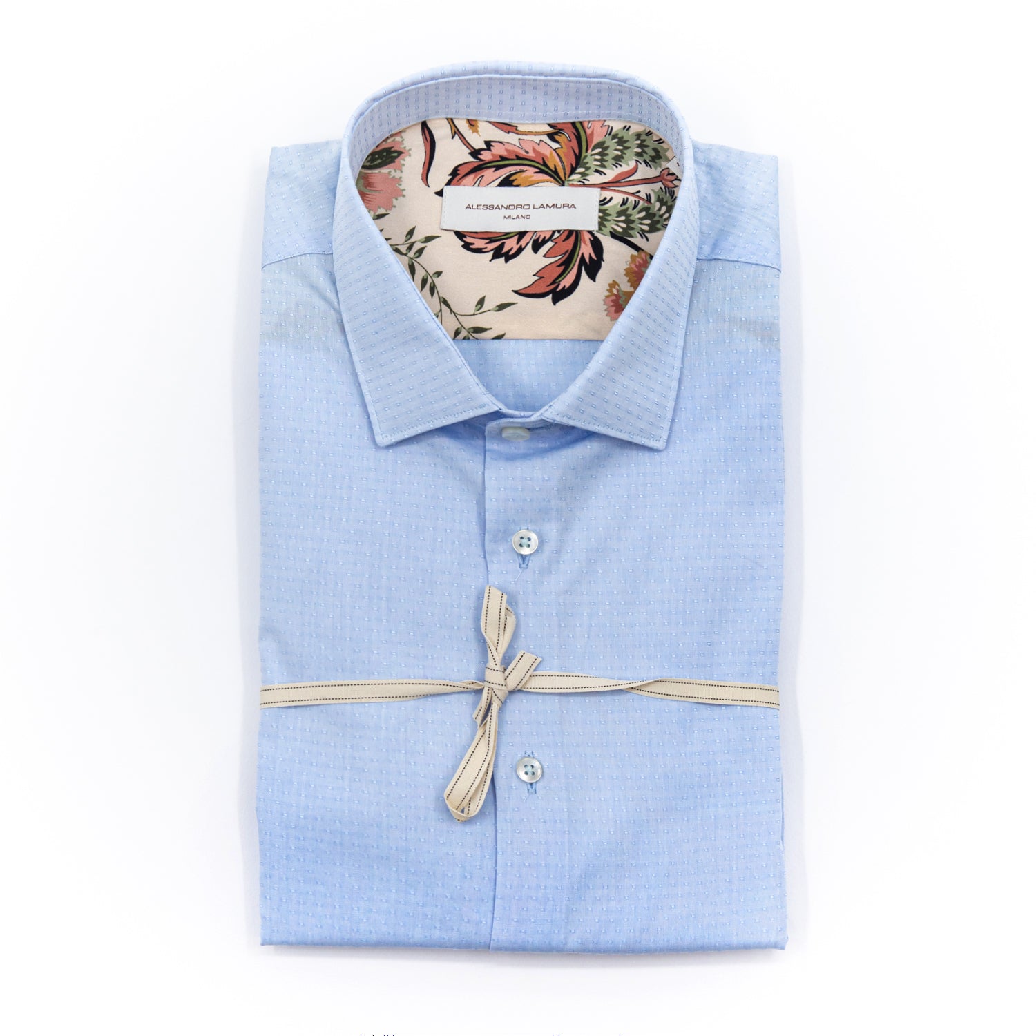 Una camicia dal carattere elegante ma ricca di personalità. Il tessuto celeste a micro rilievo dona profondità e luminosità, mentre l’interno del collo presenta una sofisticata fantasia floreale nei toni caldi, ideale per chi desidera un dettaglio distintivo senza rinunciare all’eleganza. Firmata Alessandro Lamura, è perfetta per l’ufficio, per look smart casual e per occasioni in cui è richiesto uno stile curato.